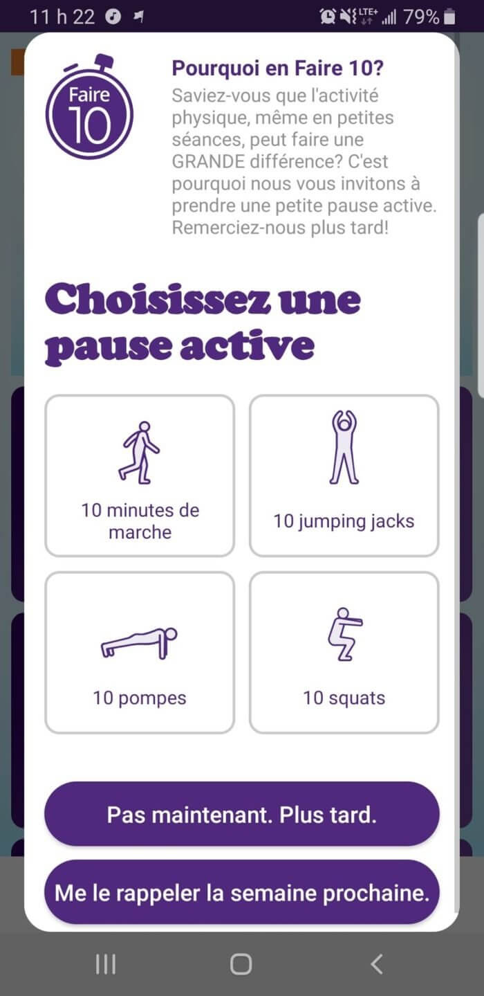 ParticipACTION Petite application super chouette qui fait le suivi de vos activités quotidiennes et hebdomadaires en vous donnant de petits défis, et qui vous donne un objectif à atteindre chaque semaine. On vous pose quelques questions de base et votre niveau d’activité et tout part de là. Il y a des badges virtuels, et de vrais tirages si vous faites les défis proposés.