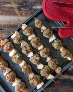 - Monter sur des brochettes de bois préalablement trempées dans l'eau froide en alternant entre boulettes et morceaux de pomme.