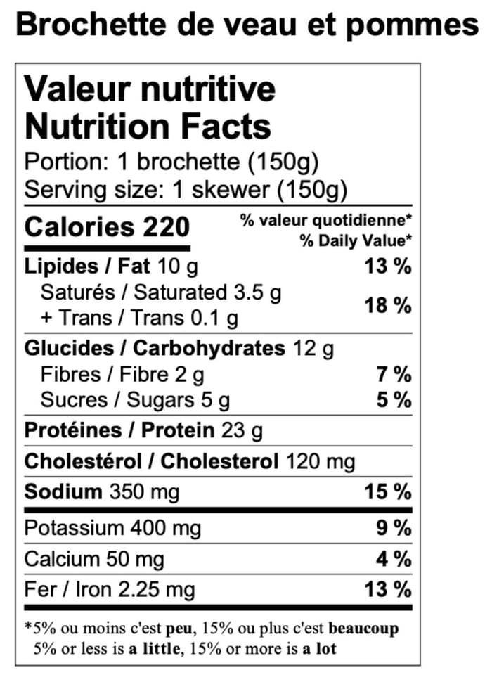 Brochettes de veau et pommes Portion: 5 brochettes Préparation: 10 minutes Cuisson : 20-25 minutes Ingrédients