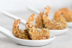 Préparation : 15 minutes Cuisson : 15 minutes Rendement : 4 INGRÉDIENTS : 225 g (½ lb) de crevettes, écaillées et déveinées 2 c. à thé (10 ml) de poudre d'ail 1/2 c. à table (7,5 ml) d'épices cajun ½ tasse (125 ml) de farine tout usage ¼ tasse (60 ml) de Mélange Coupe Faim 2.0 ¼ tasse (60 ml) de chapelure Panko 2 œufs, battus PRÉPARATION : Préchauffer le four à 350 °F Dans un bol, déposer la farine. Dans un second bol, battre les œufs. Mélanger la chapelure, la poudre d'ail, les épices cajun et le mélange coupe faim dans un troisième bol. Tremper chaque crevette dans la farine, puis dans les œufs, et ensuite dans le bol de chapelure. Cuire au four environ 15 minutes et servir. CALORIES : 280 kcal | PROTÉINES : 21 g | GLUCIDES : 35 g | GRAS TOTAUX : 8 g | GRAS SATURÉS : 1.5 g | GRAS TRANS : 0,1 g | FIBRES : 9 g | SUCRE : 1,8 g | SODIUM : 480 mg Pour vous procurer le Mélange Coupe Faim 2.0 cliquez ICI