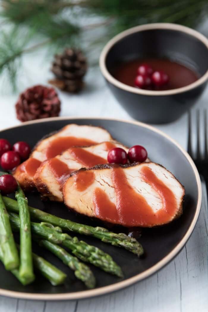 - Napper les tranches de rôti de la sauce aux canneberges et servir avec les asperges.